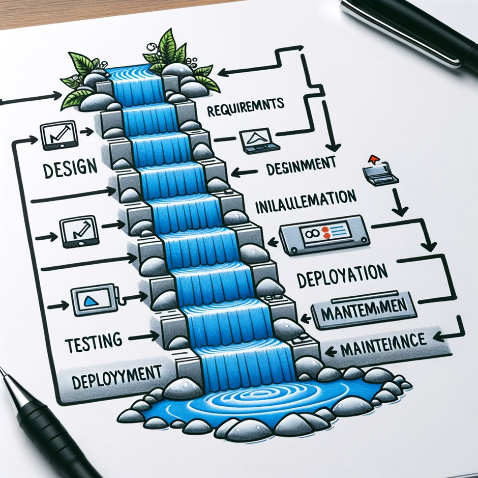 'Waterfall Model'은 소프트웨어 엔지니어링에서 전통적이고 선형적인 접근 방식으로, 소프트웨어 개발 과정이 순차적으로 진행됩니다.